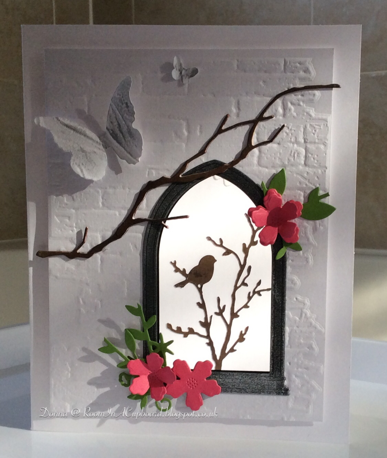 Arched Window Card, Bird on a Branch, Textured Brickwork