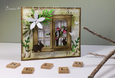 To age the Sizzix/Tim Holtz Window & Window Box die (window box not used) I used a Brilliance Moonlight White (Dew Drop) ink pad to daub on the colour haphazardly to the plain white card.  Some careful use of Gathered Twigs distress ink in places and the job was done.