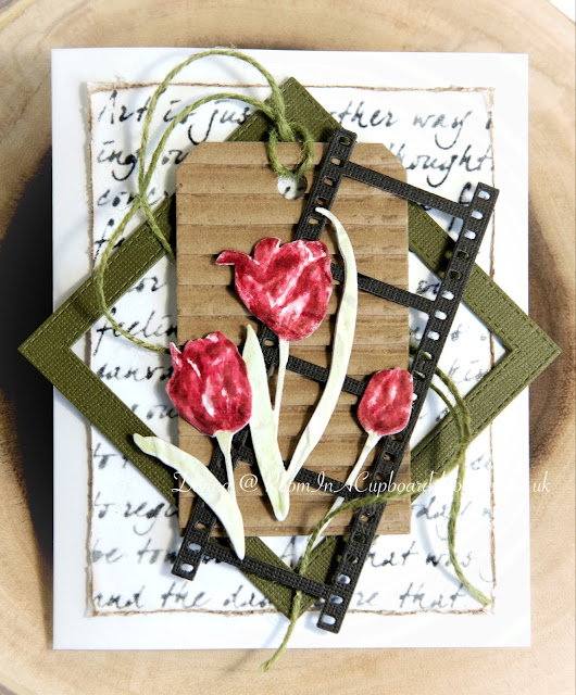 I've kept to the tulip theme, kept the red and green, dropped the sentiment, added an 'off the edge frame' filmstrip die cut and introduced some added texture with my corrugated kraft base and twine.