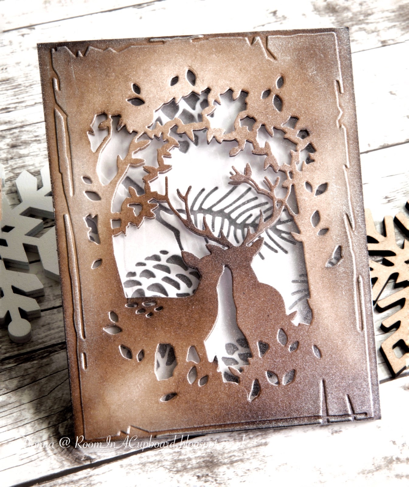 I used the biggest two dies from the Mama Elephant 'Peek A Frame' set to make two frames - and I doubled up the layers (which means cut out four - not two). The main thing here is that the frames made are the same size as the Enchanted Deer 'cut outs' - and that they aren't too thick. Even with mine I had to trim off a tiny piece that was peeking through into the 'picture'.