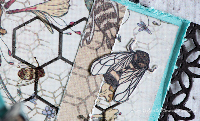 I've used the front cover of the paper pad, a sheet of the design paper to die cut a layered flower, another sheet of paper to fussy cut the bees, paper scraps from previous projects for the 'lines'... and I've stamped (don't forget to heat set) in Archival ink, partial stamped/stamped and used Embossing Powder - and added a lace edged die cut.